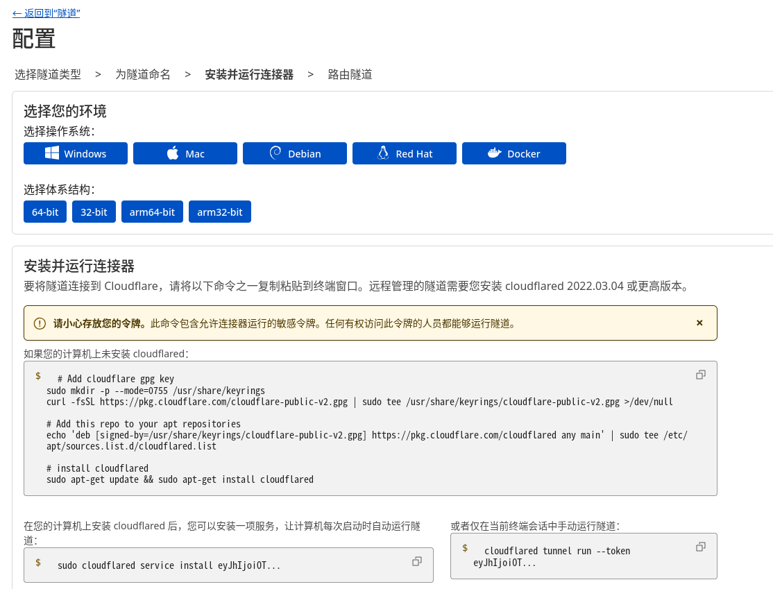sudo apt-get update && sudo apt-get install cloudflaredsudo cloudflared service install token当成功连接后网站上会有提示,紧接着下一步进入路由配置界面,按如下配置就完成了: