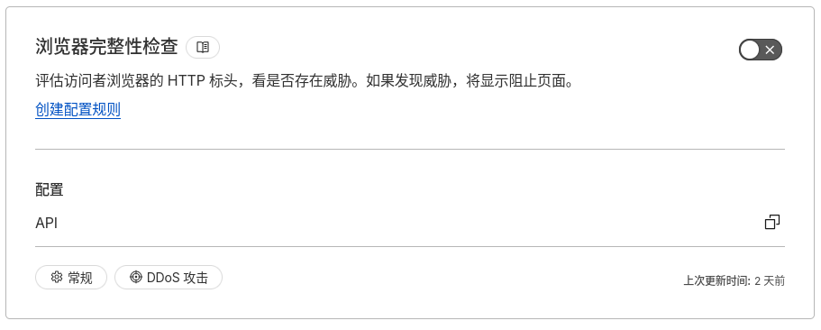 按Cloudflare默认安全设置会阻止使用代理(魔法上网)的请求,可以在Cloudflare控制台(https://dash.cloudflare.com)中安全性—设置—浏览器完整性检查关闭: